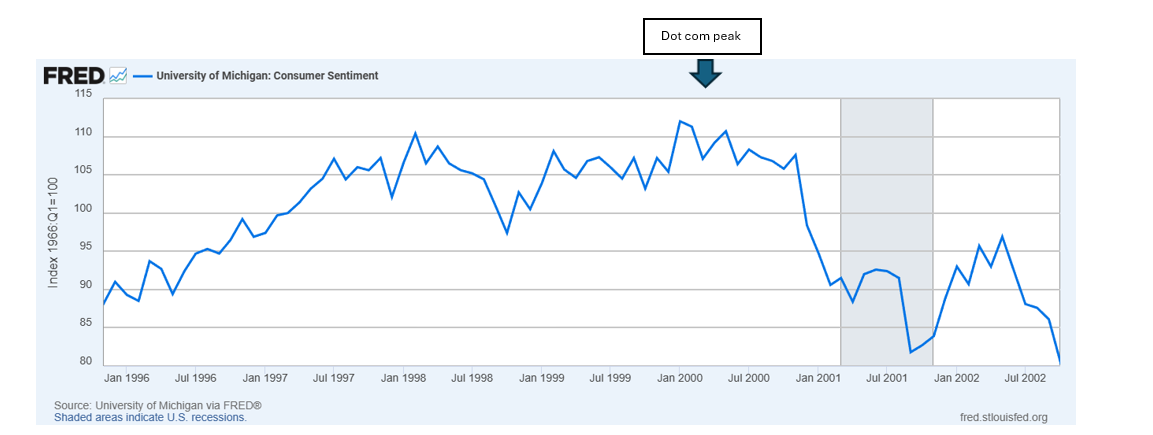 Now, we’ll jump forward 275 years to 1995, which marked the beginning of the dotcom boom. Netscape held its IPO on August 9, 1995, and, after initially pricing at $28, closed at $58.25 on its first day of trading. By the end of 1995, the stock was trading at $174 a share with a $9 billion market cap even though the company was still unprofitable. Over the next 3 years, Netscape’s stock fell 75% from its peak before being acquired by AOL in 1998. For many, Netscape’s rise and fall marks the beginning of the cycle, but it was far from the last. Companies of all sizes came to market and saw massive rises in their stock price that was often disconnected from the business’s financial standing at the time. By 1999, the NASDAQ had a price to earnings ratio, or P/E, which surpassed 90 (although this is almost certainly understated due to so many companies having no earnings, therefore, no P/E). In comparison, S&P 500 had a P/E of around 32 in that same period. Eventually, multiple factors came together to cause selling at unprecedented levels. Consumer sentiment was exceptionally high from 1997 to mid-2000. In fact, the Michigan Fed Consumer Sentiment survey, which measures consumer opinions on their current and future financial standing and their outlook on the overall economy, has spent very little time over 100 in the 25 years since 2000.