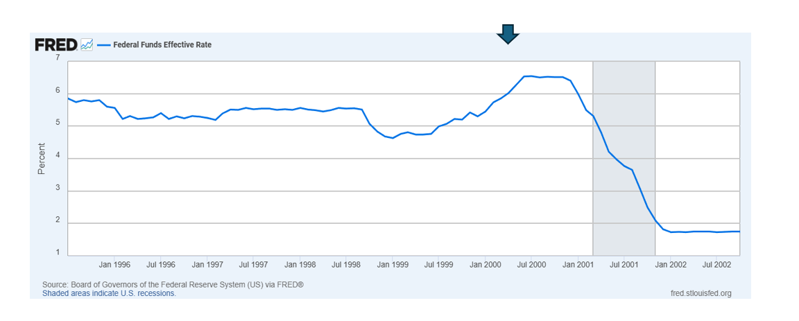Interest rates were cooperative in helping stock valuations early in the dot com craze. Rates dropped from just below 6% to 4.75% from 1995 to 1999 before inflation fears and the lowest unemployment rate in 30 years led Alan Greenspan and the Federal Reserve to hike rates six times from 4.75% to 6.50% from 1999 to mid-2000. Although Greenspan pulled off the soft landing in 1994-1995 with gradual rate hikes from 3% to 6%, his second attempt was not a success.